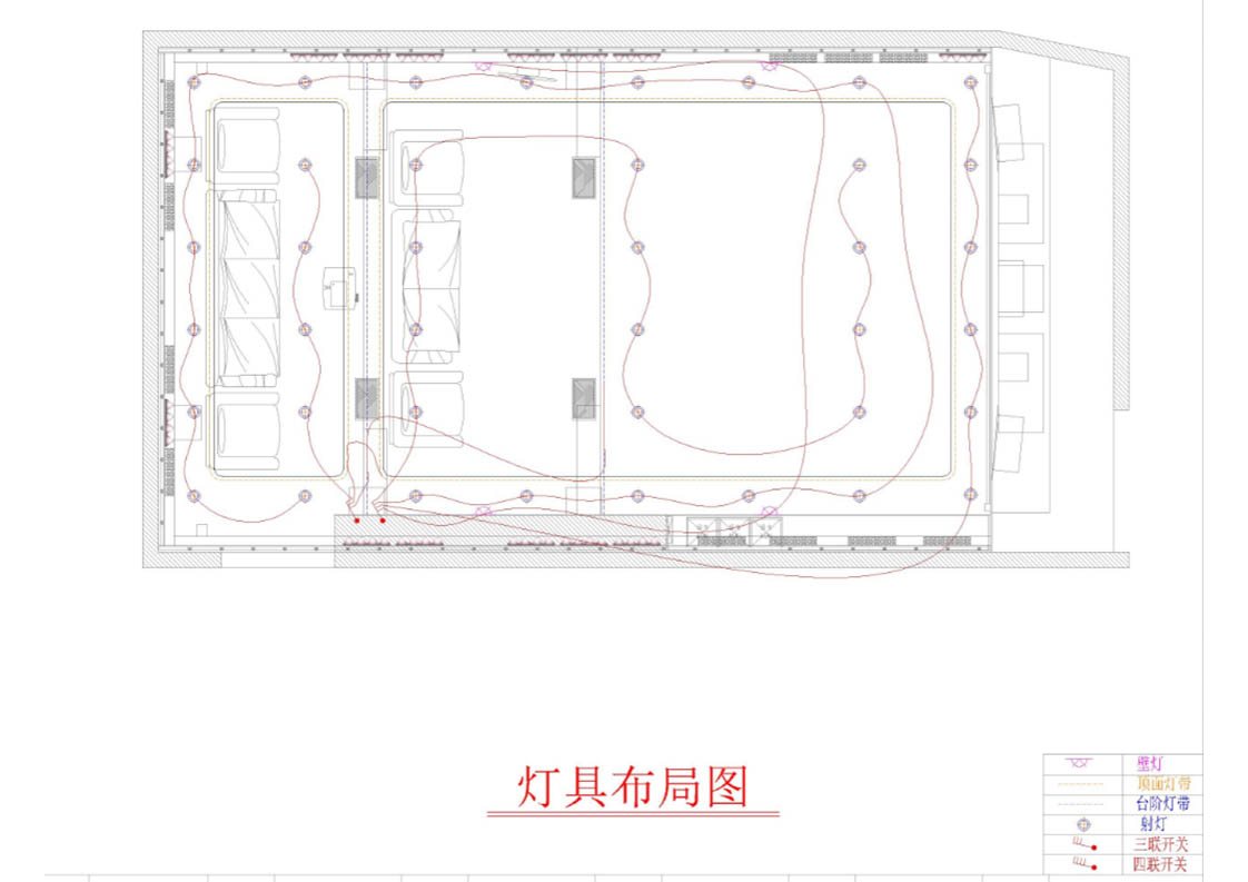 | 客户要求一定娱乐功能,考虑到氛围需要,房间天花板中设计九组射灯布局,全部由智能中控系统控制,可根据客户需要,制作多种灯光氛围效果。 |